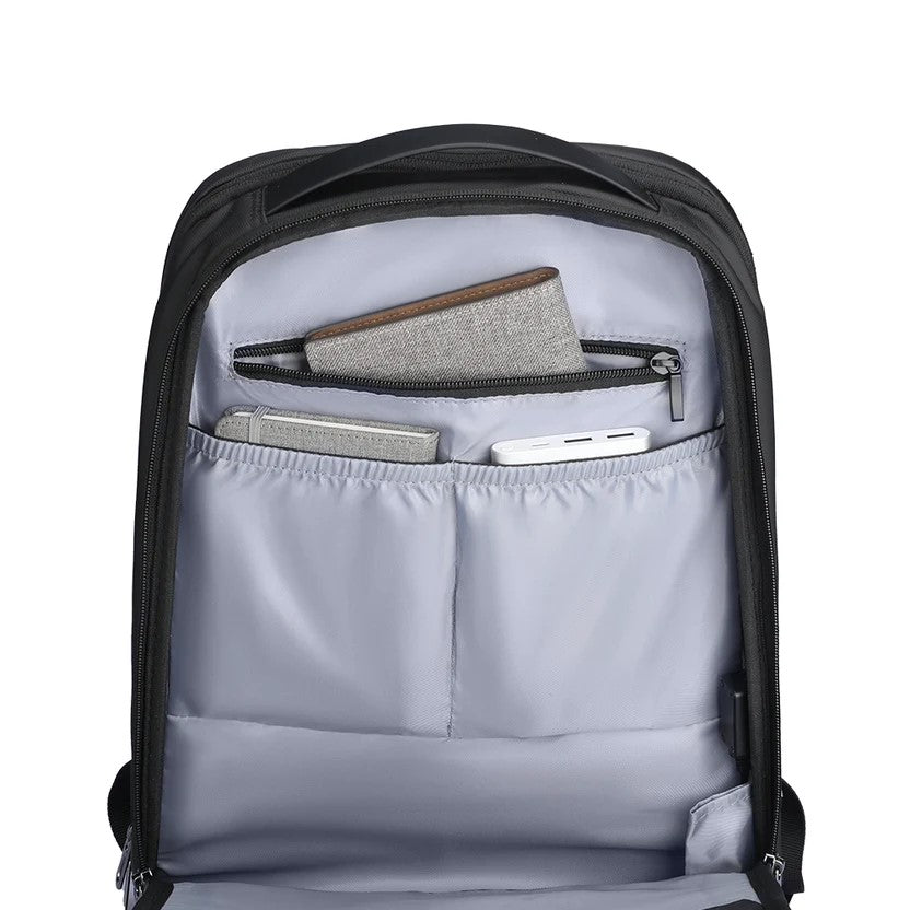 The Metropolitan II Backpack is a professional, ultra-slim (only 4.7 inches) water-repellent laptop backpack designed for everyday business use and travel, featuring smart systematic organization, a dedicated 15.6” laptop compartment, an 11” iPad pocket, durable YKK zippers, a USB charging port, a breathable and comfortable back panel, a hidden anti-theft pocket, and a luggage strap for seamless business travel.